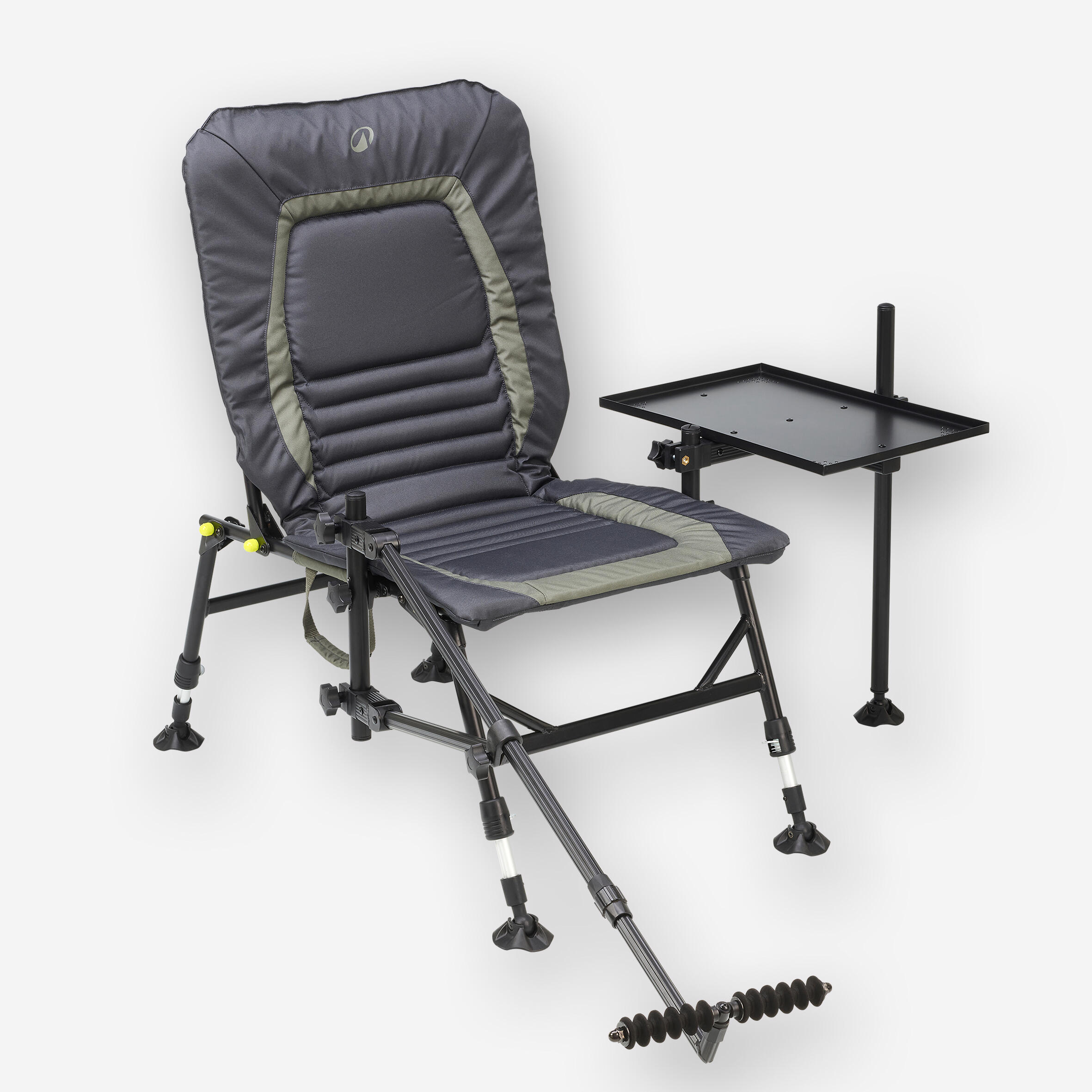 Perfekt ausgestatteter Angelstuhl mit Tischplatte, Feederarm und Rutenhalter. Hier trifft höchster Komfort auf durchdachtes Design – ideal für längere Angelsessions. Einfache Handhabung::Durch das beiliegende Zubehör schnell und einfach aufgestellt |Einfacher Transport::Mit Griff zum einfachen Transport |Kompatibilität::Beindurchmesser 25 mm, zur Befestigung von CSB-Zubehör |Stabilität::4 Teleskopbeine (Höhe 34 bis 43 cm) |Nutzerkomfort::Bequem gepolstert. Breite Sitzfläche: 53 cm