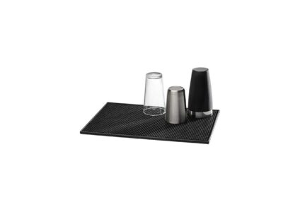Barmatte aus weichem Kunststoff zum Abtropfen von Gläsern etc. mit Noppenoberfläche. Spülmaschinengeeignet. Technische Daten: Material: Kunststoff Abmessungen: 15 x 30 cm Höhe: 1 cm Farbe: schwarz