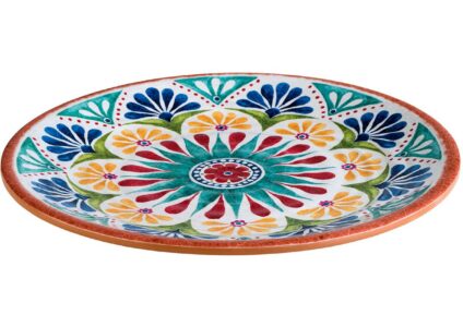 Dieser APS Essteller aus robustem Melamin hat einen Durchmesser von 26,5 cm und überzeugt durch das farbenfrohe Design. Technische Daten: Abmessungen: Ø 26,5cm Höhe: 2 cm Farbe: mehrfarbig Material: Melamin