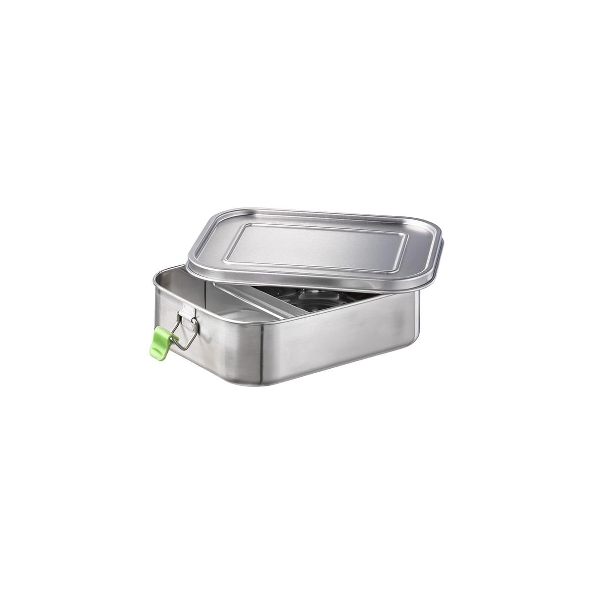 Hochwertiger Lunchbox aus Edelstahl. Innen poliert und außen mattiert mit Slikondichtung. Inklusive Trenner und auslaufsicherem Deckel. Der perfekte Begleiter für Camping und Outdoor. edles Design aus robustem Edelstahl mit auslaufsicherem Deckel großes Volumen von 1400 ml Technische Daten: Gewicht: 550 g 16,5 x 22,5 cm Höhe: 6,5 cm Volumen: 1400 ml Material: Edelstahl, Silikon, ABS Lieferumfang: Luchbox, 1400 ml