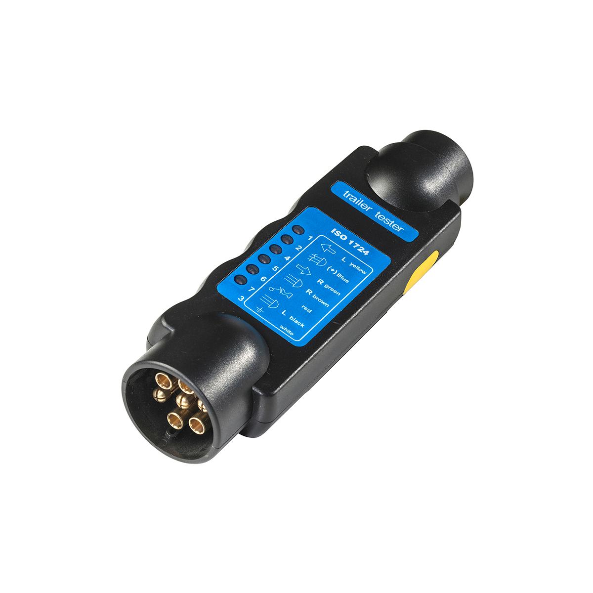 7-poliger Caravan Tester um Kabelleitungsdefekte zu finden, 12V. Produkmerkmale: Beleuchtungs- und Kabeltester für Anhänger und Zugfahrzeuge handliches Testgerät zum Finden von Kabelleitungsdefekten defekte Kabelfarben werden durch LEDs angezeigt alle 7-poligen Dosen und Stecker können geprüft werden interne Batterieversorgung, keine Fremd-Stromquelle notwendig Betrieb mit 9 V Blockbatterie (nicht im Lieferumfang enthalten)