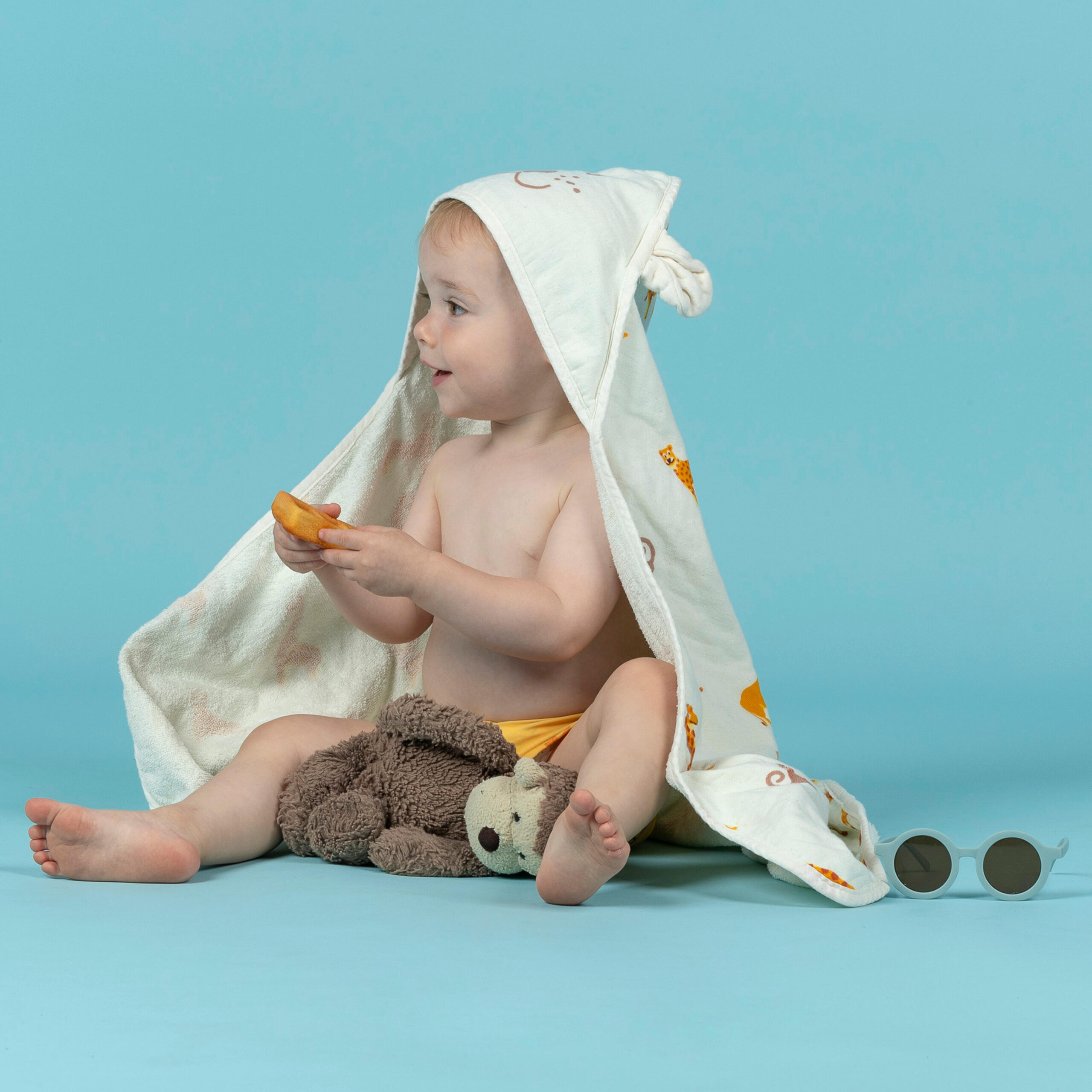 Weiches. saugstarkes Handtuch. mit dem dein Baby durch die bedeckende Form mit Kapuze schnell trocknet. 100 % Baumwolle. Innenseite aus saugstarkem Frottee|Bedeckender Schnitt für schnelles Trocknen des ganzen Körpers