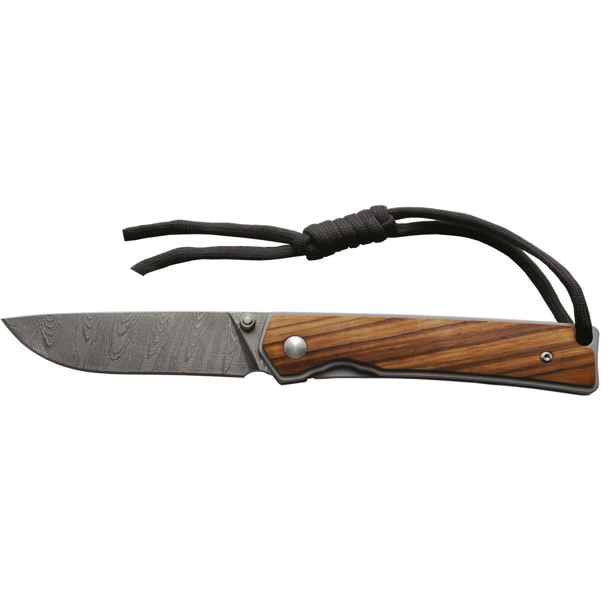 Klappbares Messer mit Klinge aus rostfreiem 420er Damaststahldesign. Der Griff aus Eschenholz lässt sich einhändig öffnen und schließen mit einem Liner-Lock-Sicherheitsmechanismus. Wird mit einer schwarzen Kordel in einem melierten grauen Beutel aus RPET geliefert. Design-Damastklinge Liner-Lock-Sicherheitsmechanismus Beutel aus recyceltem Material Technische Daten: Material: Edelstahl 420, Eschenholz Klingenlänge: 8,2 cm Maße: L 10,3 B 2,3 H 1,2 cm Gewicht: 85 g