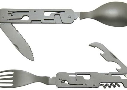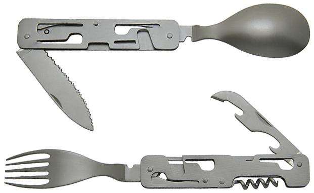 Besteckset mit 6 Funktionen: Messer mit Wellenschliff, Löffel, Gabel, Dosenöffner, Flaschenöffner und Korkenzieher. Das aus Edelstahl hergestellte Besteckset ist teilbar zur individuellen Nutzung von Gabel, Messer oder Löffel. Neoprentasche im Lieferumfang. mit 6 Funktionen inklusive Neoprentasche klappbar Technische Daten: Material: Edelstahl Gewicht: 115 g Packmaß: 11 x 4 x 3 cm