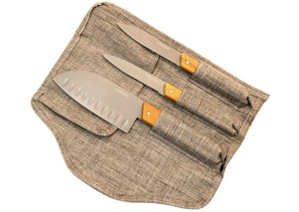Traditionelles Taschenmesser aus Edelstahl. Der formschöne Olivenholzgriff liegt gut in der Hand für Natur- und Outdoorfreunde. formschön liegt gut in der Hand Technische Daten: Santokumesser (11 cm Klinge) Schälmesser (10 cm Klinge) Tomatenmesser (10 cm Wellenschliff) rostfreiem 420er Edelstahl Griff aus Olivenholz RPET grau melierte Rolle zur Aufbewahrung inklusive