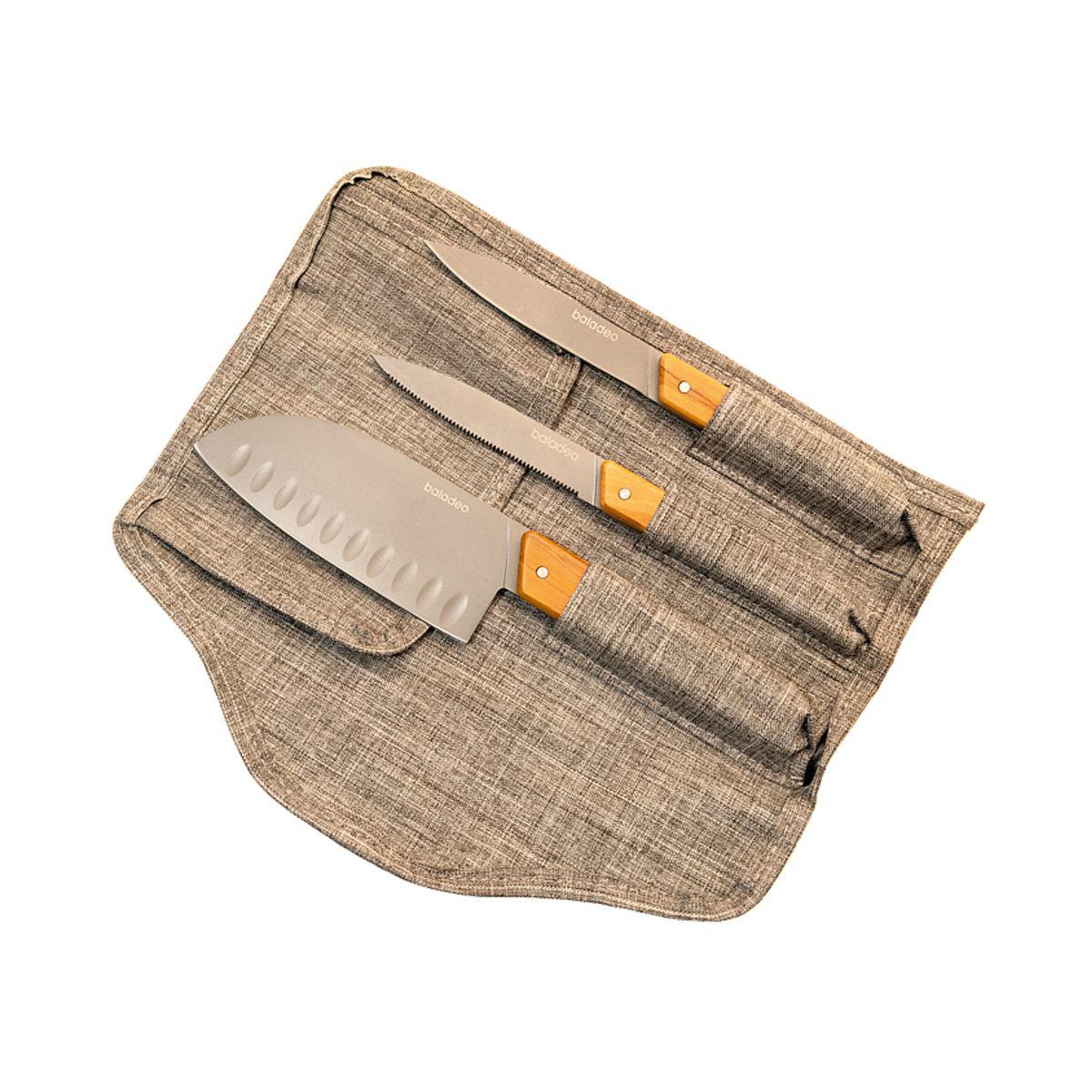 Traditionelles Taschenmesser aus Edelstahl. Der formschöne Olivenholzgriff liegt gut in der Hand für Natur- und Outdoorfreunde. formschön liegt gut in der Hand Technische Daten: Santokumesser (11 cm Klinge) Schälmesser (10 cm Klinge) Tomatenmesser (10 cm Wellenschliff) rostfreiem 420er Edelstahl Griff aus Olivenholz RPET grau melierte Rolle zur Aufbewahrung inklusive