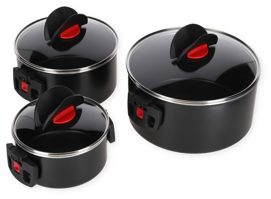 Campingkochtöpfe der absoluten Spitzenklasse. Die patentierte Arretierungsvorrichtung der Griffe erlaubt sicherste Handhabung während des Kochens. Der Griff ist so einklappbar, dass er zum Aufbewahren oder Spülen in der Spülmaschine mit dem Deckel abschließt und nicht mehr Platz einnimmt als ein Teller. Aluminium ist ein exzellenter Wärmeleiter – 3x höhere Leitfähigkeit als Gusseisen, 5x höhere als Eisen, 9x höhere als Edelstahl. Ein antihaftversiegeltes Aluminium Kochgeschirr ist daher sehr…