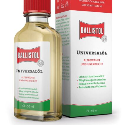 Ob für Handwerk, Haus oder Hobby, ob zum Pflegen, Schützen, Reinigen oder Schmieren, ob daheim, am Arbeitsplatz oder unterwegs – Ballistol Universalöl ist das richtige Öl für 1.000 Fälle und mehr. Es wird als Rostschutz, Schmieröl, Pflege- und Reinigungsmittel eingesetzt und glänzt dabei seit als 115 Jahren mit vielen hervorragenden Eigenschaften. Ballistol Universalöl wurde bereits 1904 entwickelt und wird seither nach unveränderter Rezeptur in Deutschland hergestellt. Alle in Ballistol Universalöl…