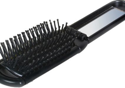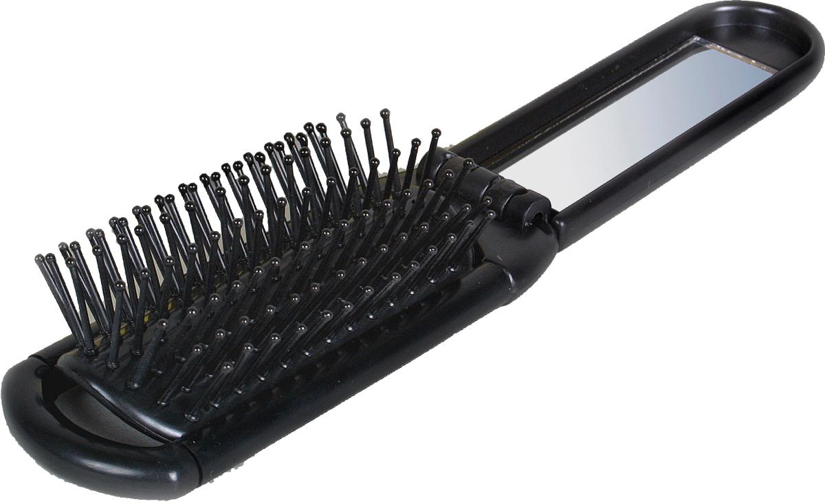 Zusammenklappbare Bürste. Die Borsten sind zusammen geklappt und lassen sich herausdrücken und zu dem sehr praktisch ist integrierte Spiegel im Griff. Technische Daten: Packmaß: 11 x 4.2 x 2.2 cm Gewicht: 45 g Farbe: schwarz