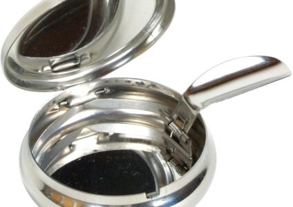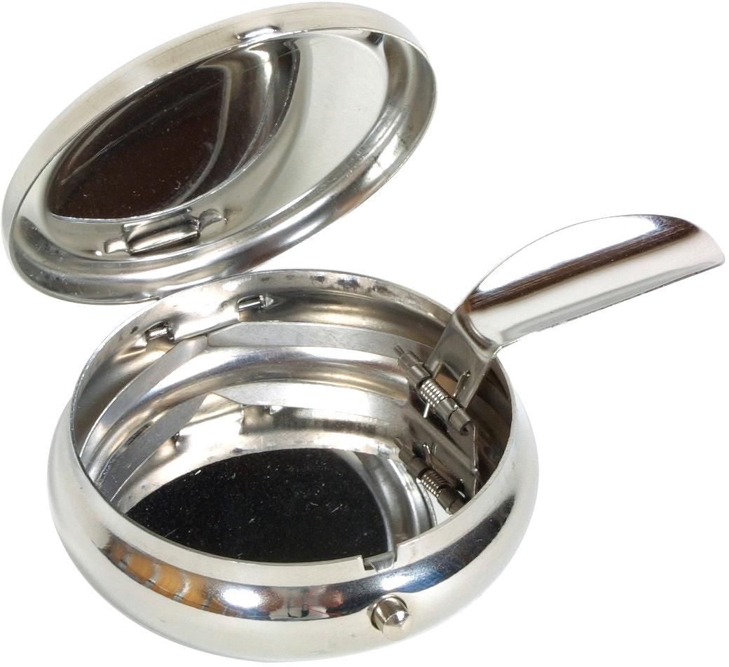 Kleiner Aschenbecher mit Deckel und ausklappbarer Zigarettenauflage (Achtung: federt aus). Wer stört sich nicht immer wieder an den Kippen an allen Orten dieser Welt. Seien Sie umweltbewusst und nehmen Sie auch den kleinen Müll wieder mit. Schöne Geschenkidee für Raucher. Technische Daten: Form: rund Maße: Ø 5 cm x H 1,5 cm