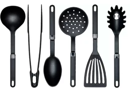 Chef Tools Set bestehend aus 6 verschiedenen Küchenhelfern mit praktischer Aufbewahrungstasche. Hitzebeständnig bis 200°C Technische Daten: Material: Nylon Packmaße: 35 x 10 x 8 cm Farbe: schwarz Lieferumfang: 1 x Kelle 1 x Schaumlöffel 1 x Pfannenwender 1 x Nudelzange 1 x Servierlöffel 1 x Zange