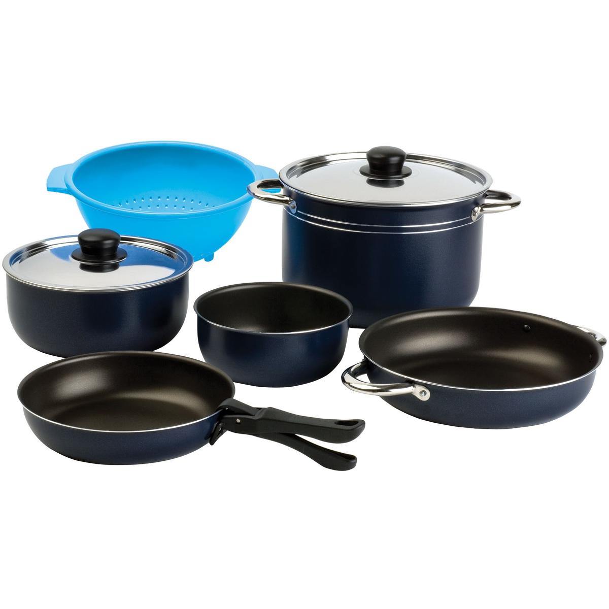 Dieses praktische Aluminium Kochset eignet sich ideal für 5 Personen und ist der perfekte Begleiter für unterwegs antihaft beschichtet edelstahl Griffe Technische Daten: max. Inhalt 5 liter Gewicht 2,10 kg Set bestehend aus: Topf ø 22 cm Pfanne ø 22 cm Kasserolle ø 20 cm Kasserolle ø 16 cm Pfanne ø 20 cm Kunststoff Sieb ø 22 cm Edelstahl Deckel ø 22 cm Edelstahl Deckel ø 20 cm Hanz-Griff