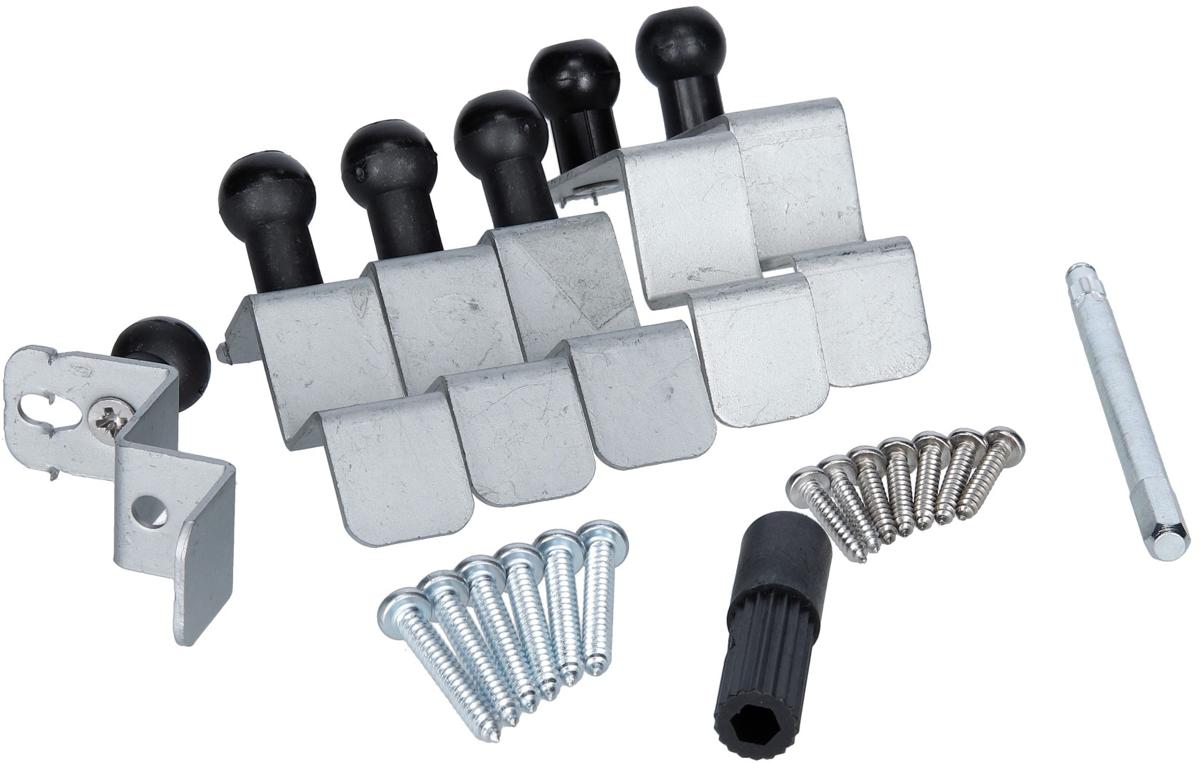 Befestigungsklammersatz für REMItop vario II Kurbelhaube, Dachhauben-Ausschnittmaß 400 x 400 mm und Dachstärke 36-45 mm Lieferumfang: 2x Klammer Kopfteil 4x Klammer Seitenteil 6x Schraube 4×30 6x Schraube 3,5×19 1x Achsverlängerung Abb. Nr. 5 Remis Artikel-Nr. 10033504