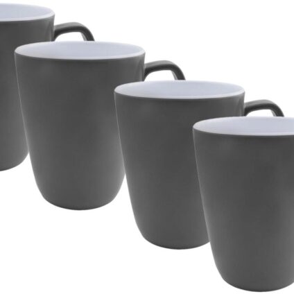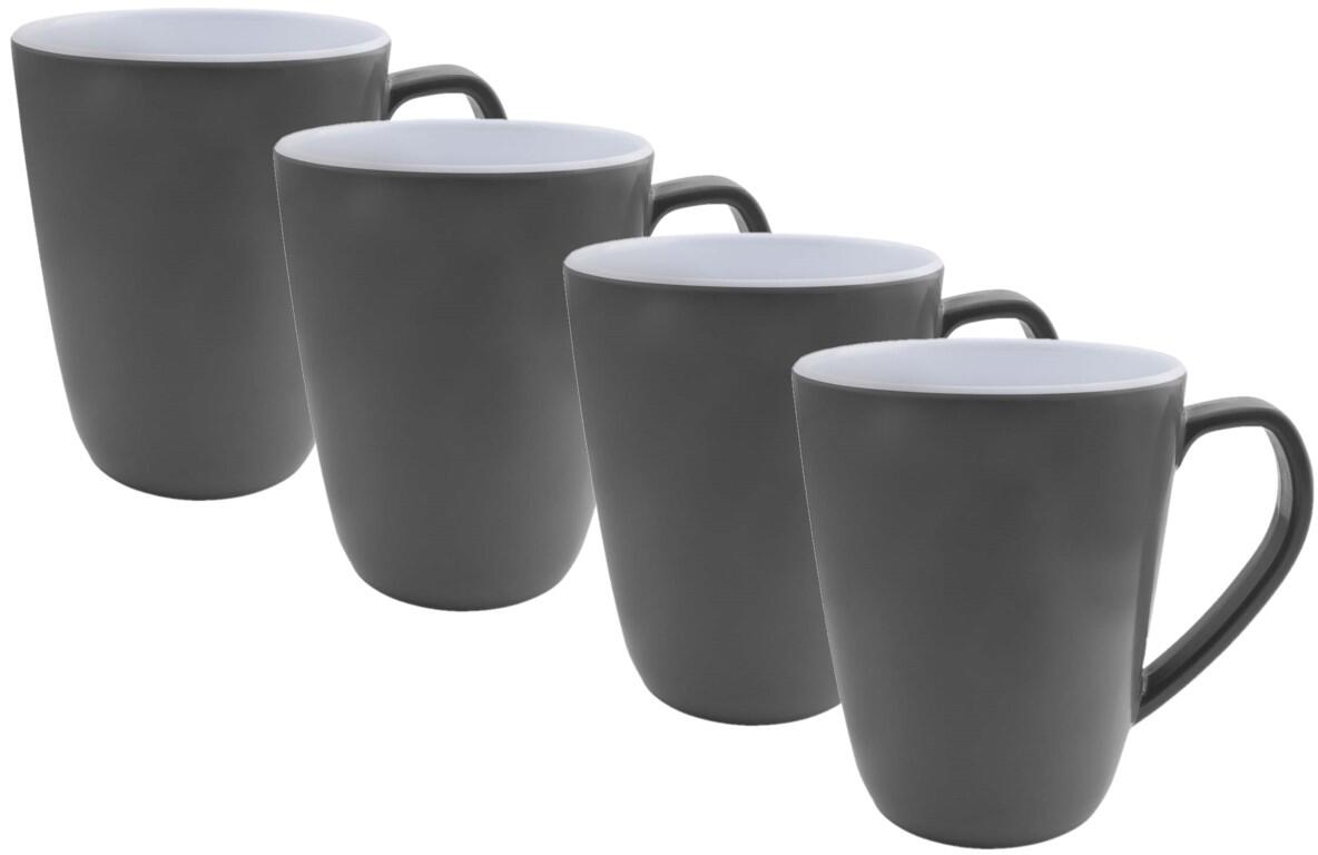 Ein Set aus 4 leichten und robusten Bechern mit Henkel. Praktisch unzerbrechlich und kratzfest. Schmutz und Flecken mit Spülmittel entfernen. Keine Scheuermittel oder Topfkratzer benutzen. Technische Daten: Material: Melamin Produkthöhe: 11 cm Durchmesser: Ø 8,5 cm Gewicht: 0,6 kg Farbe: grau Fassungsvermögen (ml): 350 ml Lieferumfang: 4x Tasse: 400 ml