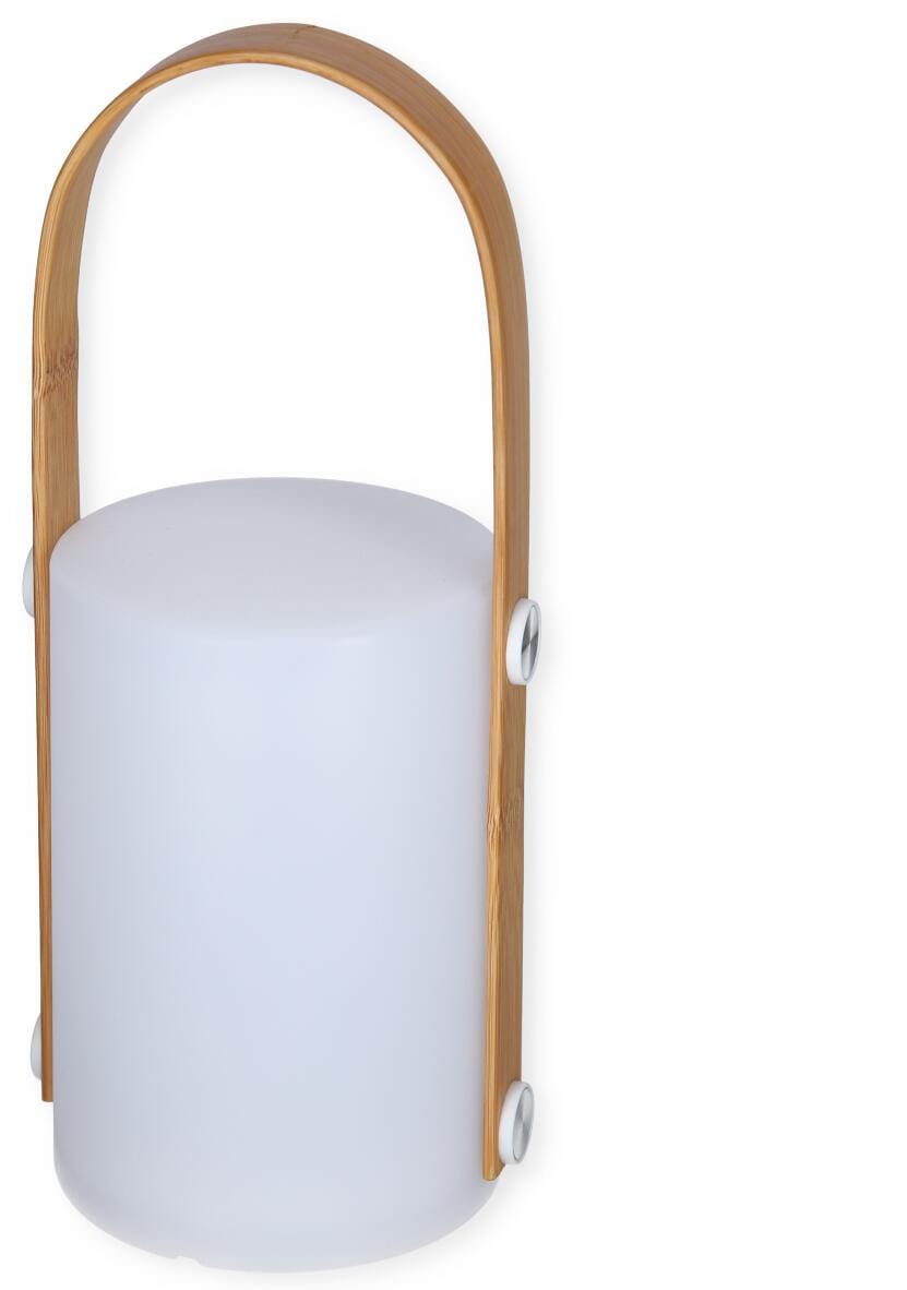 Eine stimmungsvolle wiederaufladbare Tischlampe im stilvollen Outdoor-Look. Verleiht ein angenehmes Licht durch die warmweiße LED-Beleuchtung. Ausgestattet mit 3 Lichtmodi, einem Kunststoffgehäuse und einem Bambusgriff. Der eingebaute Li-Ionen-Akku kann mit einem mitgelieferten USB-Kabel aufgeladen werden. Ideal für einen Tisch oder Schrank. Stimmungsvolle wiederaufladbare Tischleuchte mit stilvollem Look. Warmweiße LED-Beleuchtung mit 3 Lichtmodi. Ausgestattet mit einem Kunststoffgehäuse mit…