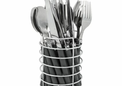 Das 24- teilige Besteckset von Bo-Camp ist für 6 Personen geeignet. Edelstahlbesteck mit Kunststoffgriff geliefert in einem Korb Spülmaschinengeeignet Technische Daten: Material: Edelstahl Farbe: grau Produkthöhe: 22 cm Durchmesser: Ø 10,5 cm Gewicht: 800 g
