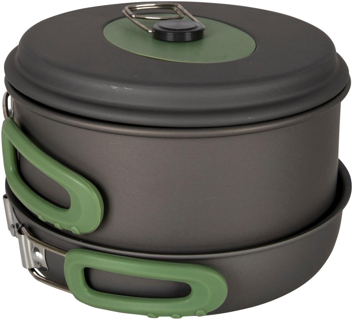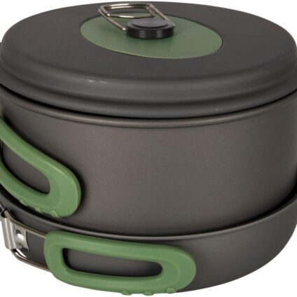 Ein komplettes und geräumiges 3-teiliges leichtes Kochset. Bestehend aus 2 Kochtöpfen und einer Bratpfanne. Ideal für den Einsatz im Freien geeignet. Das Set ist mit hitzebeständigen und klappbaren Griffen aus Silikon ausgestattet. Hergestellt aus massivem, hart eloxiertem Aluminium, so dass die Gefahr des Anbrennens verringert wird. Geeignet für Gas- und Benzinbrenner. Die Pfannen sind stapelbar und somit kompakt zu lagern und zu transportieren, inklusive Tragetasche. Technische Daten: Pfanne: Ø 15,5…