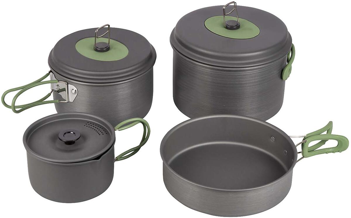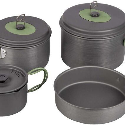 Ein komplettes und leichtes vierteiliges Kochtopfset. Dieses Kochtopfset besteht aus drei Töpfen mit Deckeln und einer Bratpfanne. Hervorragend für die Outdoor-Verwendung geeignet. Für Gas- und Benzinbrenner geeignet. Hergestellt aus robustem, hart eloxiertem Aluminium, was das Anbrennen verhindert. Topf und Pfannen sind mit hitzebeständigen Silikon-Klappgriffen ausgestattet. Nach Gebrauch können diese Handgriffe einfach angeklappt werden, so dass die Töpfe kompakt zu lagern und zu transportieren sind….