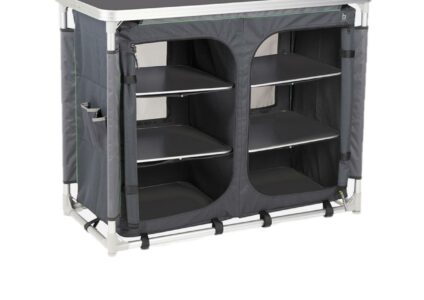 Bo-Camp Louise Kochinsel mit 6 Ablageböden, Seitentaschen und 4 verstellbaren füßen. Hitzebeständige und wasserfeste Platte Leichter Aluminiumrahmen Luxuriöses, solides 2-Ton 600D-Polyester-Gewebe Geeignet für 4-Flammen Gaskocher Hitzebeständige Tischplatte Feuchtigkeitsresistente Tischplatte Technische Daten: Material: Aluminium Farbe: grau Maße (L x B x H): 100 x 48 x 80 cm Maße gefaltet (L x B x H): 104 x 49,5 x 11,5 cm Gewicht: 11,5 kg