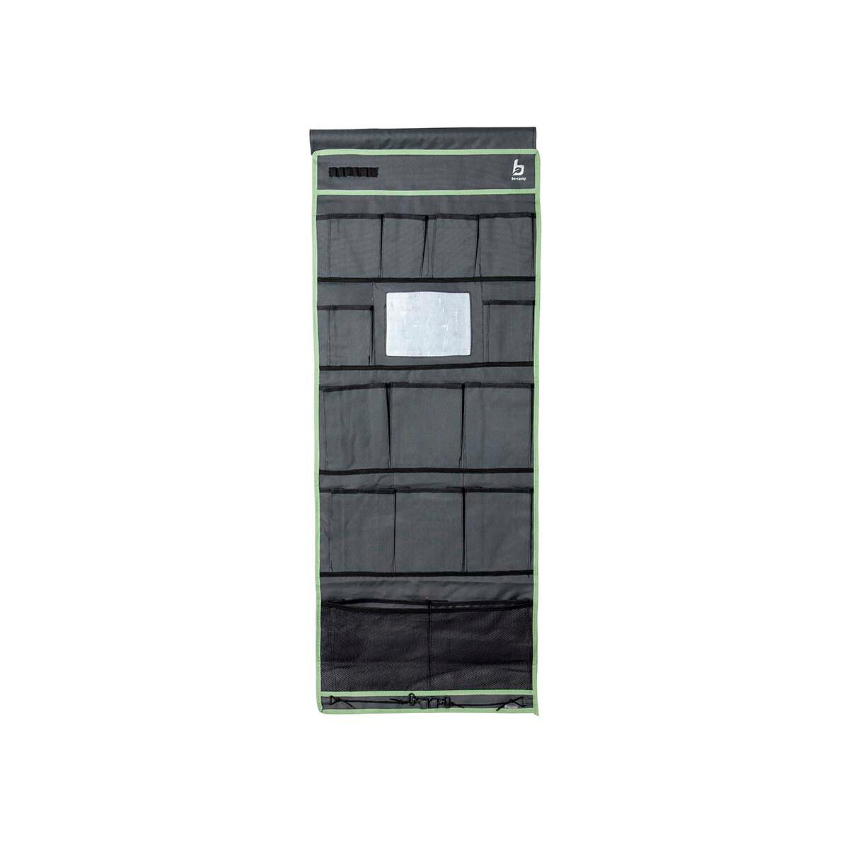 Multifunktionaler Organizer mit 15 Fächern + Spiegel. Ideal für Zelt oder Wohnwagen. Mit mehreren großen Fächern. Mit Klettverschluss oder Leine oder an den Aufhängösen zu befestigen. Mit Schlaufen an der Unterseite für zusätzliche Befestigung. Technische Daten: Material: Oxford Polyester Produktlänge: 123 cm Produktbreite: 48 cm Gewicht: 0,5 kg Farbe: anthrazit Anzahl der Fächer: 14