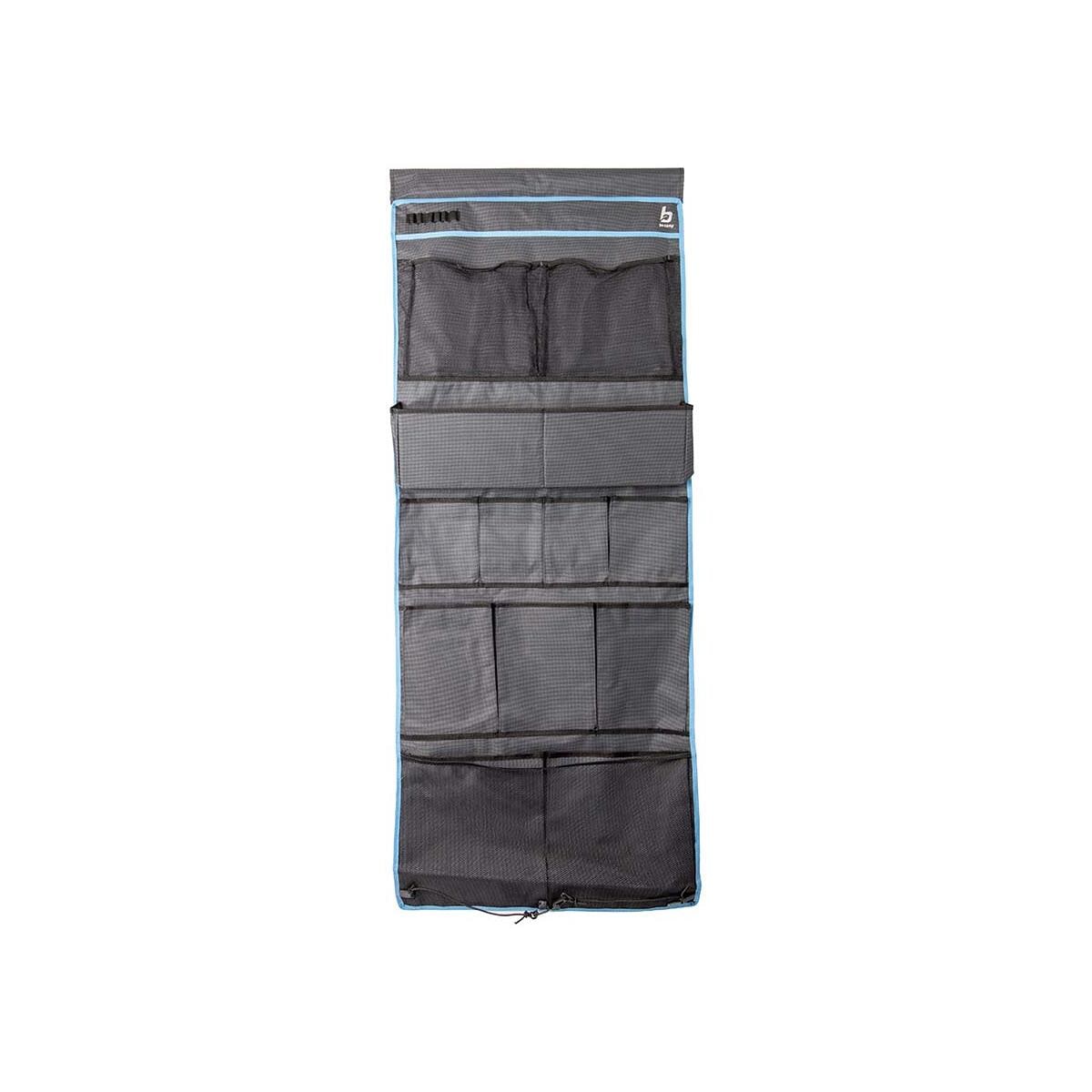 Ein geräumiger Multifunktionsorganizer mit 14 Fächern. Mit fünf Reihen von je zwei bis vier Fächern. Wird mit Klettverschluss, einem Tau oder an den Aufhängeösen befestigt. Inklusive Schlaufen an der Unterseite für zusätzliche Befestigung. Technische Daten: Material: Oxford Polyester Produktlänge: 160 cm Produktbreite: 60 cm Gewicht: 1 kg Farbe: anthrazit Anzahl der Fächer: 13
