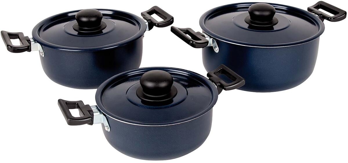 Aus leichtem Aluminium. 3 Töpfe. Mit Antihaftbeschichtung. Mit hitzebeständigen Griffen. Geeignet für Gas. Technische Daten: Material: Aluminium Durchmesser: Ø 12/16/20 cm Gewicht: 1,1 kg Farbe: blau Lieferumfang: 1 Topf: Ø 16 cm, 1,4 L 1 Topf: Ø 18 cm, 2 L 1 Topf: Ø 20 cm, 2,8 L