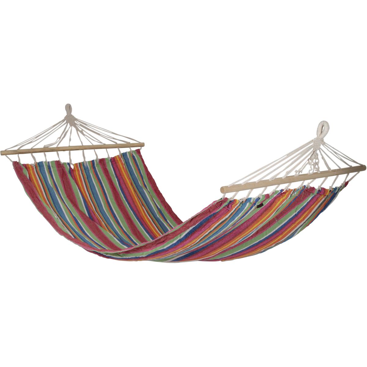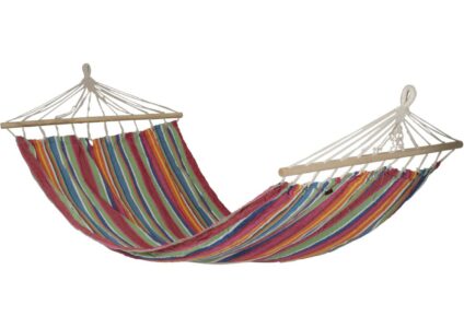Eine fröhlich und robuste Hängematte. Zum Entspannen im Urlaub, im Garten oder auf dem Balkon. Hergestellt aus robustem 320gr/m² Baumwolle/Polyester. Die Hängematte hat an den Enden einen Spreizstab von 100 cm, so dass der Stoff immer ganz offen ist. Maximale Belastbarkeit: 150 Kilogramm. Sehr luxuriöse und komfortable Hängematte. Robuste Qualität von Baumwolle/Polyester für den Innen- und Außenbereich. Inklusive Spreizstock von 100 cm für einen wunderbar stabilen Standort. Die Hängematte bleibt wegen…
