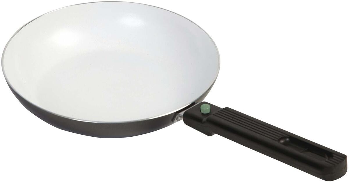 Eine kompakte Bratpfanne mit einer Keramikbeschichtung. Diese Pfanne hat einen abnehmbaren Griff und ist daher platzsparend. Die Keramikbeschichtung verhindert das Anhaften, ist kratzfest und leicht zu reinigen. Außerdem ist es gesünder zu kochen, da weniger Fett zum Braten benötigt wird. geeignet für Gas-, Keramik- und Elektroherde abnhembarer Griff Technische Daten: Material: Aluminium Produktlänge: 26 cm Produktbreite: 26 cm Produkthöhe: 4 cm Durchmesser: Ø 26 cm Gewicht: 0,5 kg Farbe: schwarz
