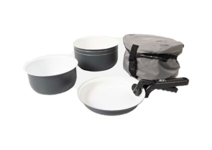 Ein komplettes und geräumiges 5-teiliges leichtes Kochset. Bestehend aus 2 Kochtöpfen und einer Bratpfanne. Ideal für den Einsatz im Freien geeignet. Das Set ist mit hitzebeständigen und klappbaren Griffen aus Silikon ausgestattet. Hergestellt aus massivem, hart eloxiertem Aluminium, so dass die Gefahr des Anbrennens verringert wird. Geeignet für Gas- und Benzinbrenner. Die Pfannen sind stapelbar und somit kompakt zu lagern und zu transportieren, inklusive Tragetasche. aus leichtem Aluminium mit…