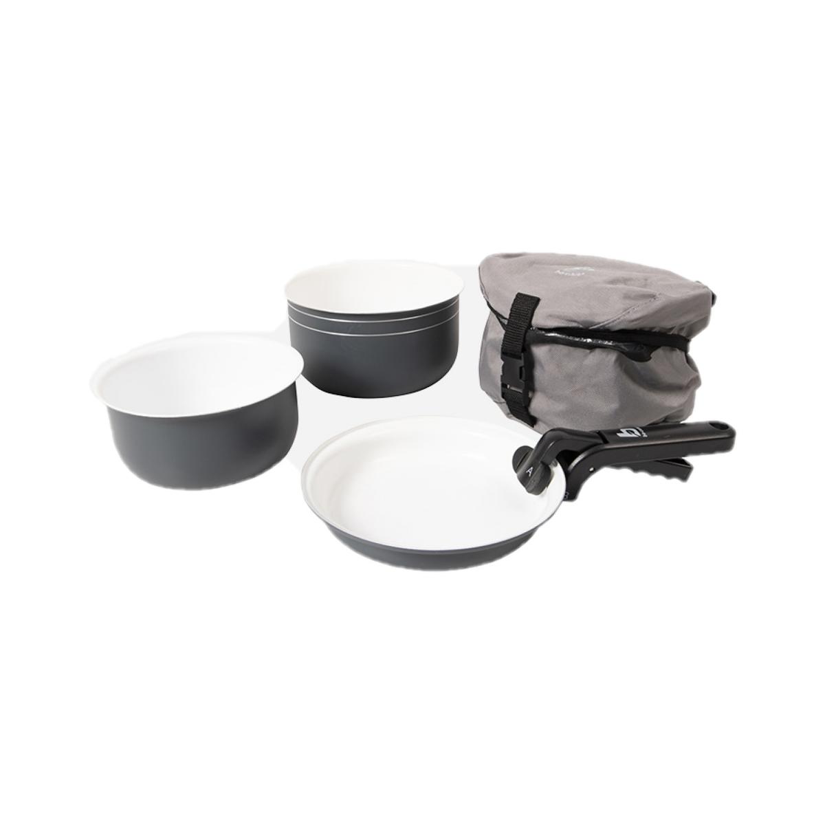 Ein komplettes und geräumiges 5-teiliges leichtes Kochset. Bestehend aus 2 Kochtöpfen und einer Bratpfanne. Ideal für den Einsatz im Freien geeignet. Das Set ist mit hitzebeständigen und klappbaren Griffen aus Silikon ausgestattet. Hergestellt aus massivem, hart eloxiertem Aluminium, so dass die Gefahr des Anbrennens verringert wird. Geeignet für Gas- und Benzinbrenner. Die Pfannen sind stapelbar und somit kompakt zu lagern und zu transportieren, inklusive Tragetasche. aus leichtem Aluminium mit…