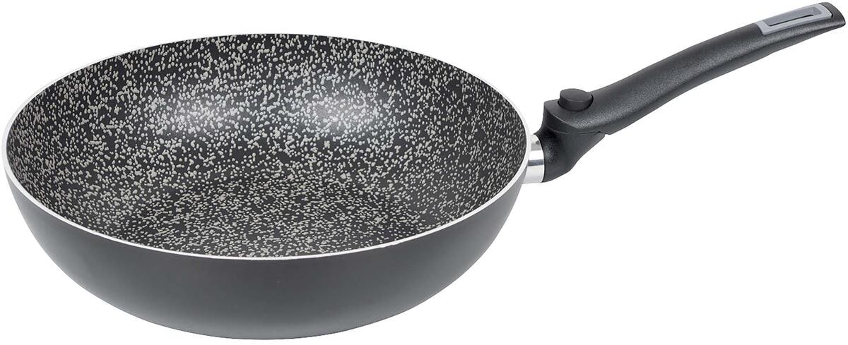 Eine Aluminium-Wok-Pfanne mit einem hohen Rand. Diese leichte Pfanne ist mit einer 5-lagigen Salus Stone®-Beschichtung und einem rutschfesten Boden versehen. Dank des wegklappbaren Griffs ist die Pfanne platzsparend und leicht zu tragen. Spülmaschinenfest und geeignet für Gas-, Keramik-, Elektrische und Induktion Wärmequellen. Dicke: 2,5 Millimeter. Platzsparende Wok-Pfanne Durch den klappbaren Griff lässt sich diese Pfanne kompakt aufbewahren Mit robuster und haltbarer 5-lagiger Salus…