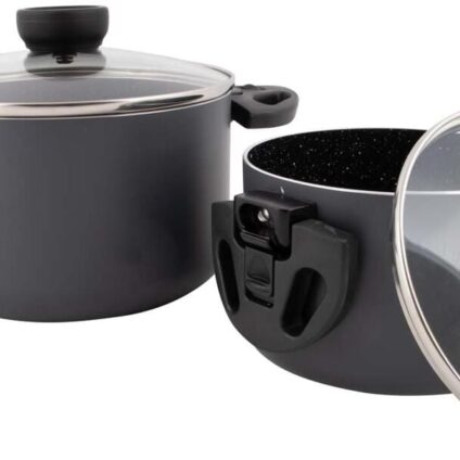 Ein anthrazitfarbenes 2-teiliges Topfset. Die Keramikbeschichtung verhindert das Anhaften, ist kratzfest und leicht zu reinigen. Darüber hinaus ist es gesünder zu kochen, da weniger Fett zum Braten benötigt wird. Diese Pfannen sind mit robusten und hitzebeständigen Klappgriffen ausgestattet. Diese Griffe lassen sich nach Gebrauch einfach einklappen, so dass die Pfannen vollständig ineinander geschoben und kompakt gelagert werden können. Die Pfannen sind außerdem mit einem hitzebeständigen Knopf am…