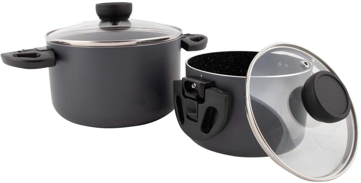 Ein anthrazitfarbenes 2-teiliges Topfset. Die Keramikbeschichtung verhindert das Anhaften, ist kratzfest und leicht zu reinigen. Darüber hinaus ist es gesünder zu kochen, da weniger Fett zum Braten benötigt wird. Diese Pfannen sind mit robusten und hitzebeständigen Klappgriffen ausgestattet. Diese Griffe lassen sich nach Gebrauch einfach einklappen, so dass die Pfannen vollständig ineinander geschoben und kompakt gelagert werden können. Die Pfannen sind außerdem mit einem hitzebeständigen Knopf am…