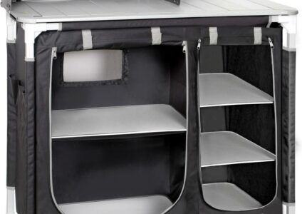 Ein vormontiertes Rahmengestänge aus Aluminium, auf das ein hochwertiger Bezug aus widerstandsfähigem Polyester aufgezogen wird, bildet das Gerüst für die in Anthrazit gehaltenen Schränke. Die abriebfesten, aus Ripstop Polyester gefertigten Gestängekanäle des Bezugs, in dem rückseitig eine Lüftungsgaze eingearbeitet ist, sorgen für schnellen Auf- und Abbau, die Ablageböden werden einfach eingelegt. Alle Drehteller-Füße sind höhenverstellbar und sorgen auch auf unebenem Untergrund für sicheren Stand. Den…