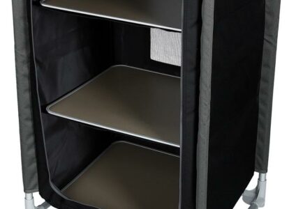Ein zum Teil vormontiertes Rahmengestänge, auf das ein hochwertiger Bezug aus widerstandsfähigem, recyclebarem Polyester aufgezogen wird, bildet das Gerüst für die in Anthrazit gehaltenen Schränke. Die abriebfesten, aus Ripstop Nylon gefertigten Gestängekanäle des Bezugs, in dem rückseitig in Lüftungsgaze eingearbeitet ist, sorgen für schnellen Auf- und Abbau, die Ablageböden werden einfach einglegt. Den oberen Abschluss der stabilen Konstruktion bildet eine Ablageplatte. mit 3 Innenablagen inkl….