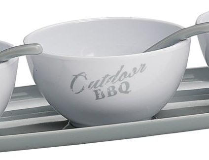 Das BBGrill Geschirr aus Melamin darf auf keiner Grillparty fehlen. Mit seinem Anti-Slip-Untergrund eignet es sich hervorragend für das perfekte Grillevent auf unebenen Flächen. Das hübsche Design schafft eine klare Linie und kommt mit bunten Gerichten sehr gut zur Geltung. langlebig und pflegeleicht lebensmittelecht gefrierschrankfest spülmaschinenfest bruchsicher mit Anti-Slip Technische Daten: Material: Melamin Maße: 3 x Ø 11 cm / 40 cm Lieferumfang: 3 Schalen 1 Tablett