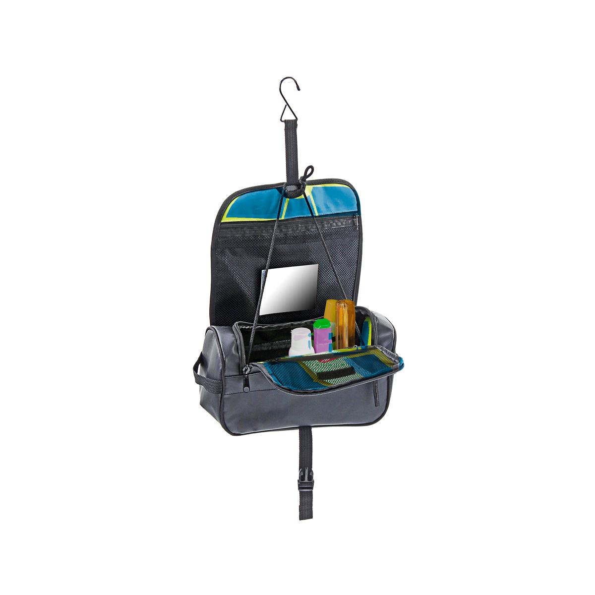 Praktischer Kulturbeutel aus sehr widerstandsfähigem, beidseitig beschichtetem Gewebe. Großes Hauptfach mit Reissverschlußdeckel und Spiegel. Versenkbarer Metallhaken zum Aufhängen. Großes Hauptfach 2 Netztaschen Versenkbarer Metallhaken Bruchfester Spiegel Mit seitlichen Griffen Abwaschbar Technische Daten: Maße offen: 25,5 x 12 x 48,5 cm Maße geschlossen: 25,5 x 12 x 15 cm Gewicht: 0,35 g Gewebe: PVC / Polyester