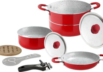 8+2-teiliges Alu-Kochtopfset mit langlebiger Antihaft-Keramikbeschichtung. Hohe Kratzfestigkeit. Silikonbeschichtete Griffe. Leicht zu reinigen. inklusive Transportbox für alle Herdarten geeignet Technische Daten: Gewicht: 4,20 kg Material: Aluminium Lieferumfang: 1 Topf: Ø 22 cm – 5,0 L 1 Topf: Ø 18 cm – 1,4 L 1 Topf: Ø 22 cm – 1,5 L 1 Deckel: Ø 22 cm 1 Deckel Ø 18 cm 1 Löffelablage 1 Topfträger 1 abnehmbarer Griff 1 Transportbox 1 Untersetzer