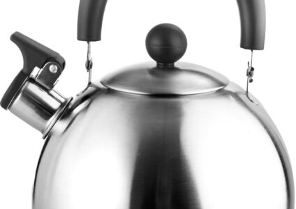 Formschöner Flötenkessel aus Edelstahl mit induktionsgeeignetem Topfboden und rutschfesten, gummierten Griffen. Elegantes Design. induktionsgeeignet mit gummiertem Griff Technische Daten: Volumen: 1,8 Liter Maße (⌀ x H): 18 × 21 cm Material: Edelstahl Gewicht: 420 g Farbe: silber