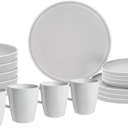 Mit dieser Geschirrserie sind Sie für jede Mahlzeit ausgestattet. Das neu entwickelte Stone Touch Geschirr aus einem Melamin-Mineralgemisch hat hervorragende funktionelle Eigenschaften. Die Becher sind aus Resylin, ein farbloser Thermoplast auf ABS-Basis (Acrylnitrilbutadienstyrol), bei dem sich gute mechanische Eigenschaften mit einer guten Chemikalienbeständigkeit verbinden. 100% BPA-frei und lebensmittelecht mit ausgezeichneten Isolationseigenschaften. Dank der Verwendung einer in den Tellerboden…