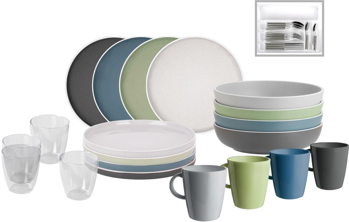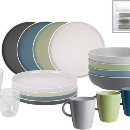 Mit dieser Geschirrserie sind Sie für jede Mahlzeit ausgestattet. Das All Inclusive-Geschirrset mit 36 Teilen und Transportbox bietet alles was man für 4 Personen benötigt. Das neu entwickelte Stone Touch Geschirr aus einem Melamin-Mineralgemisch hat hervorragende funktionelle Eigenschaften. Die Becher sind aus Resylin, ein farbloser Thermoplast auf ABS-Basis (Acrylnitrilbutadienstyrol), bei dem sich gute mechanische Eigenschaften mit einer guten Chemikalienbeständigkeit verbinden. 100% BPA-frei und…