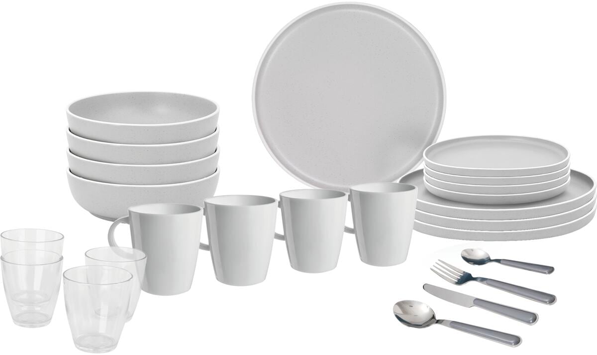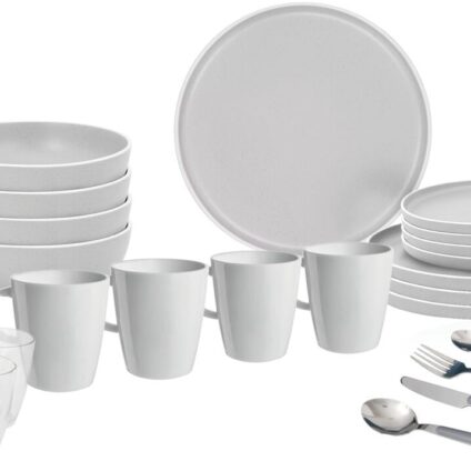 Mit dieser Geschirrserie sind Sie für jede Mahlzeit ausgestattet. Das All Inclusive-Geschirrset mit 36 Teilen und Transportbox bietet alles was man für 4 Personen benötigt. Das neu entwickelte Stone Touch Geschirr aus einem Melamin-Mineralgemisch hat hervorragende funktionelle Eigenschaften. Die Becher sind aus Resylin, ein farbloser Thermoplast auf ABS-Basis (Acrylnitrilbutadienstyrol), bei dem sich gute mechanische Eigenschaften mit einer guten Chemikalienbeständigkeit verbinden. 100% BPA-frei und…