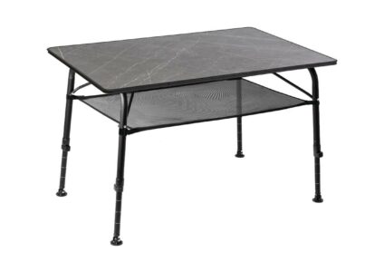 Erstklassiger Camping- und Outdoortisch mit neu entwickeltem, exklusivem Faltmechanismus und ultraleichter Tischplatte mit umlaufendem Alu-Profil. Dank einer zentralen Gleitschiene erfolgen Auf- und Abbau des stabilen Tischgestells sekundenschnell und problemlos. ultraleichte Konstruktion hitzebeständige und wetterfeste Tischplatte exklusiver Faltmechanismus stufenlos höhenverstellbar Technische Daten: Gestell: eloxiertes Aluminium ø 28/25 mm Belastbarkeit: 30 kg Maße: 100 x 70 x 50,5/70 cm Packmaß: 100…