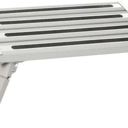 Super stabile Trittstufe mit einklappbaren Standbeinen. Robuste Konstruktion aus pulverlackiertem Aluminium. Hohe Standfestigkeit. Mit großflächiger, rutschfester Trittfläche. Sehr kompaktes Maß. In der XL-Version mit noch mehr Sicherheit durch großzügig vergrößerte Trittfläche. Technische Daten: Typ: GoStep NG Material: Aluminium Belastbar bis: 150 kg Höhe: 23 cm Maße (B x T): 47,5 × 30 cm Gewicht: 2,7 kg