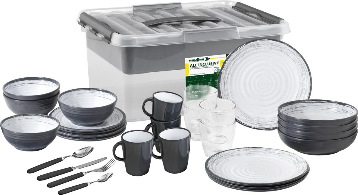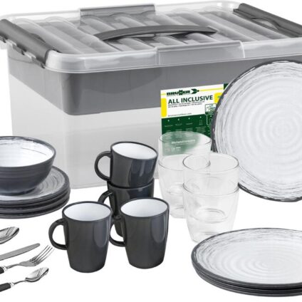 Mit dieser Geschirrserie sind Sie für jede Mahlzeit ausgestattet. Das All Inclusive-Geschirrset mit 40 Teilen und Transportbox bietet alles was man für 4 Personen benötigt. Das neu entwickelte Stone Touch Geschirr aus einem Melamin-Mineralgemisch hat hervorragende funktionelle Eigenschaften. Die Becher sind aus Resylin, ein farbloser Thermoplast auf ABS-Basis (Acrylnitrilbutadienstyrol), bei dem sich gute mechanische Eigenschaften mit einer guten Chemikalienbeständigkeit verbinden. 100% BPA-frei und…