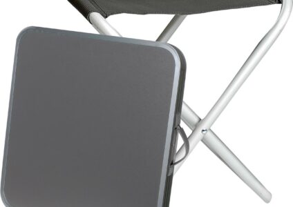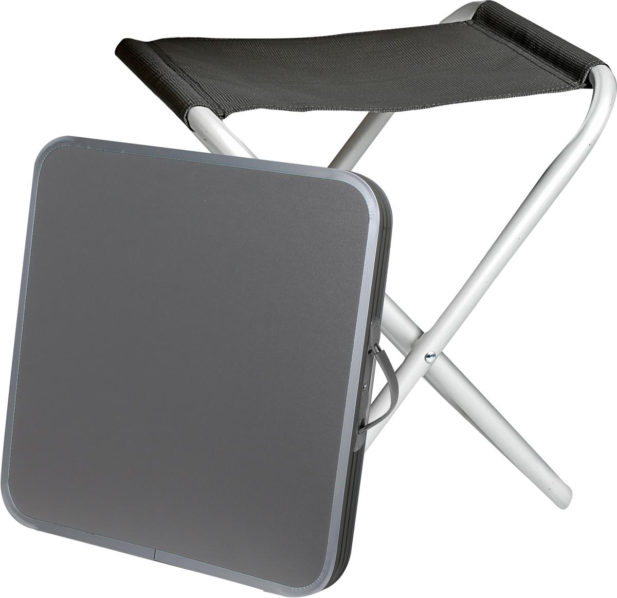 Praktisches Set bestehend aus einem leichten, klappbaren Aluminiumhocker mit Polyester-Sitzbezug und einer stabilen Tischplatte. leicht zu transportieren Technische Daten: Material: Polyester Gestell: Aluminium Max. Tragekraft: 90 kg Maße: ausgestellt: 40 x 40 x H43 eingeklappt: 55 x 40 x 7,4 cm Lieferumfang: 1 x Hockerset inkl. Tragetasche
