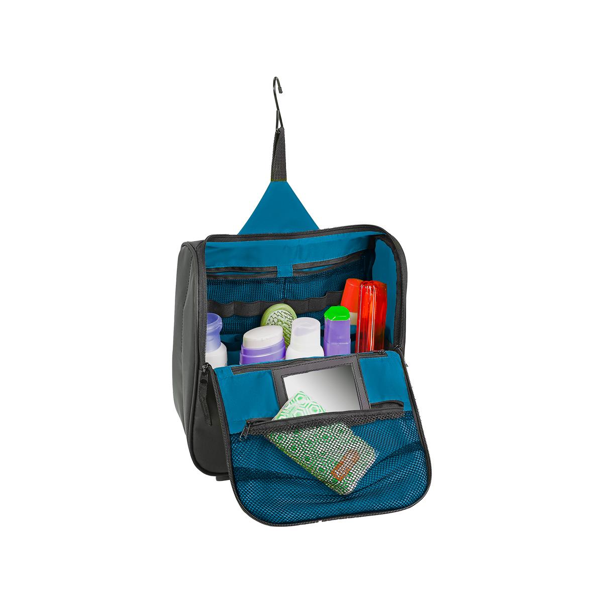 Die gepolsterte Kulturtasche bietet Platz für den großen Urlaub. Sie ist stabil und standfest. Der große Innenraum mit neun Taschen, davon vier mit RVverschließbar, nimmt Shampoo und Co. bequem auf. Eine große Außentasche mit herausnehmbarem Metallhaken zum Aufhängen, erweitert das großzügige Platzangebot. Technische Daten: Maße offen: 26 x 14 x 37 cm Maße geschlossen: 25 x 13 x 28 cm Gewicht: 415 g Material: PVC / Polyester