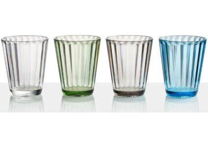Elegantes Trinkglas-Set im Vintage-Look. Stapelbare Form. lebensmittelecht spülmaschinengeeignet bis 70°C Technische Daten: Material: Polycarbonat Volumen: 350 ml je Glas Nettogewicht: 340 g Packmaß: 38 x 10 x 8,5 cm Lieferumfang: 4 Trinkgläser