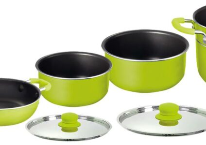 Alu-Topfset mit Edelstahldeckel und Soft-Touch Griffen. Mit Antihaft-Beschichtung. für alle Herdarten geeignet (außer Induktion) Technische Daten: Material: Aluminium Farbe: grün, schwarz Packmaß: 26 × 17 × 35 cm Gewicht: 3,4 kg Lieferumfang: 1 Topf mit Griffen ø 20 cm (4 l) 1 Pfanne mit Griffen ø 20 cm (1,5 l) 1 Deckel ø 20 cm 1 kleiner Topf ø 16 cm (1 l) 1 Deckel ø 16 cm 1 kleiner Topf ø 14 cm (0,75 l) 1 Griff 1 Zurrgurt
