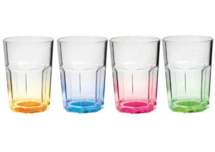 Trinkglas mit farbiger Basis und praktischem Antislip-Ring. Der im Glasboden integrierte Antirutschring verhindert effektiv das Verrutschen des Trinkglases auf Tischen oder in den Schränken. Stapelbar. Aus SAN, ein transparenter und steifer Kunststoff. Lebensmittelecht, weitgehend spülmaschinengeeignet und somit für den Küchenbedarf bestens geeignet. mit Antislip-Ring am Boden lebensmittelecht spülmaschinengeeignet bis 70°C Technische Daten: Volumen: je 280 ml Material: SAN Lieferumfang: 4…